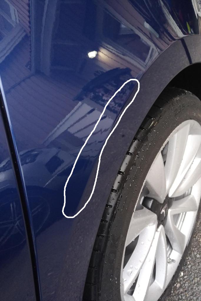 Hämtade ut min Model 3 LR AWD 19 tum, blåmetallic, i torsdag. Noterade vid hämtningen i Trosta att det fanns en artfakt i plåten alt lacken ovanför vänster bakre skärmkant, som en presskant som löper 10mm ovanför vecket, kanske 30 cm lång synlig defekt. Såg en röd metallic Model 3 i helgen, en kille...