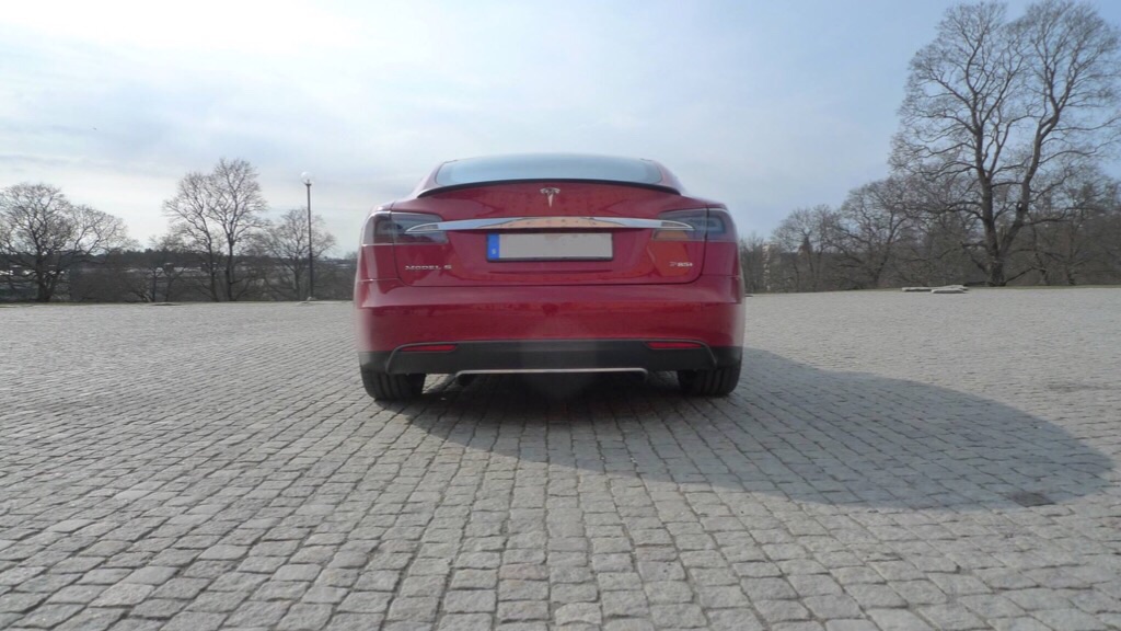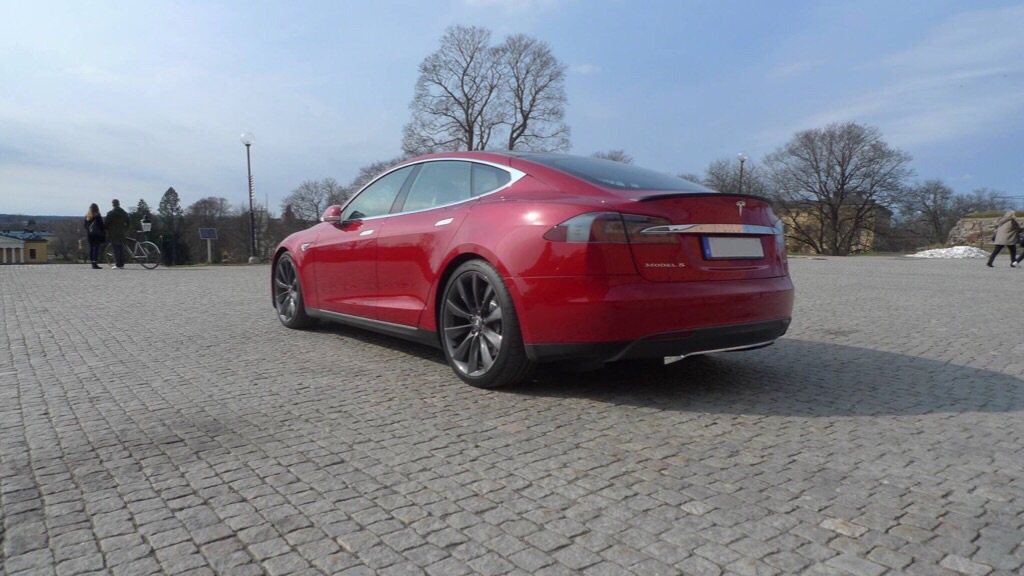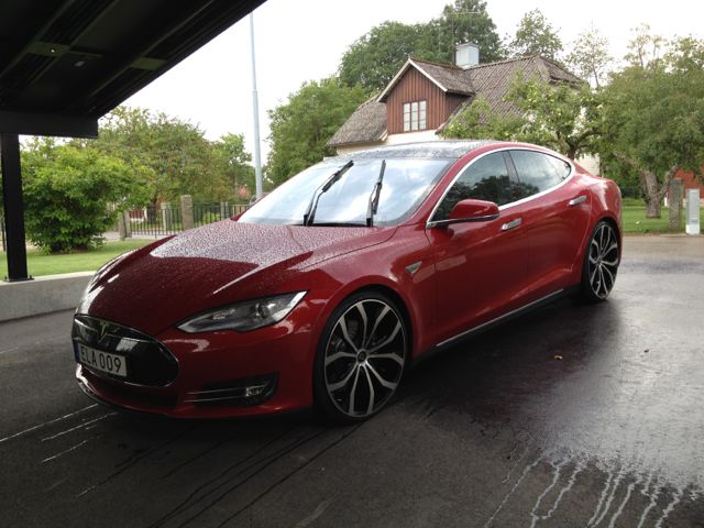 Tesla model S P85+, multicoat red, gray 21" turbine wheels with Michelin PS2. At Uppsala castle.