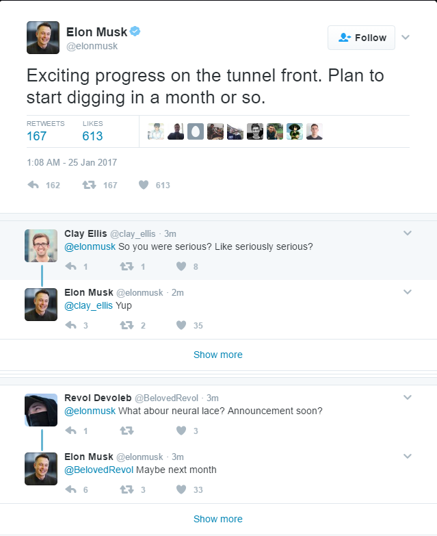 Bara det är ju värt att starta bolaget för, helt genialt. Gör man raketer, elbilar och soltak är ett tunnel-bolag rätt boring. Kul lek med orden.12man skrev:bolaget ska heta "The Boring Company" ivf