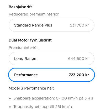 För min del är priset mindre intressant än förmånsvärdet tyvärr. Sjukt sugen på en Performance men totalkostnaden på en sån är nästan lika hög som på min S 100D. Skulle faktiskt vara billigare att ha en till 100D...