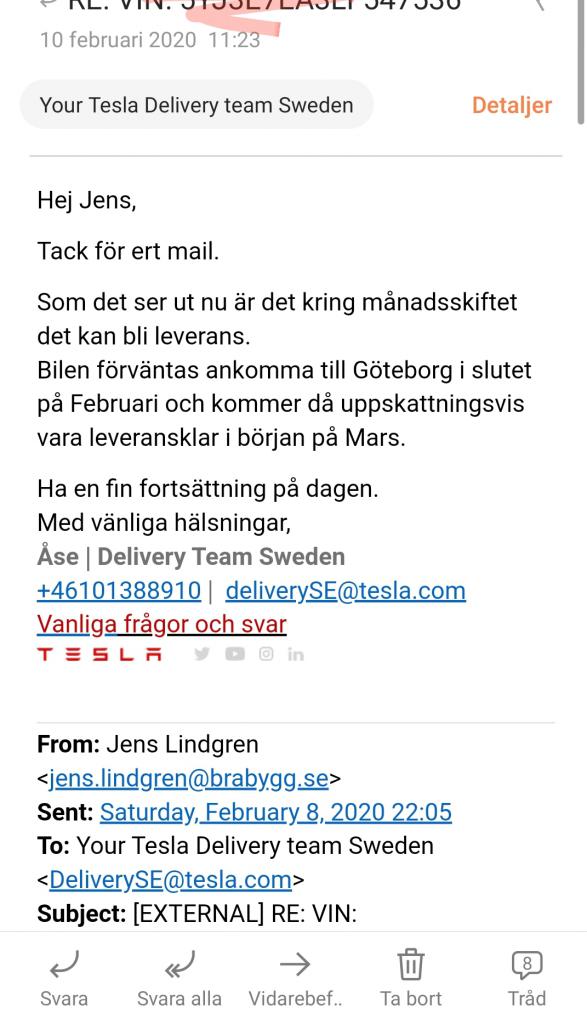 Jag har beställt en röd M3P, med svart interiör och utan vinterdäck på 2020-02-01 med privat avbetalning. DNB accepterade min ansökan samma dag och tesla-killen sa att den beräknade leverans en är slutet av Mars. Jag vet inte vad jag kan förvänta mig. Leverans till Stockholm. Vad tror ni?