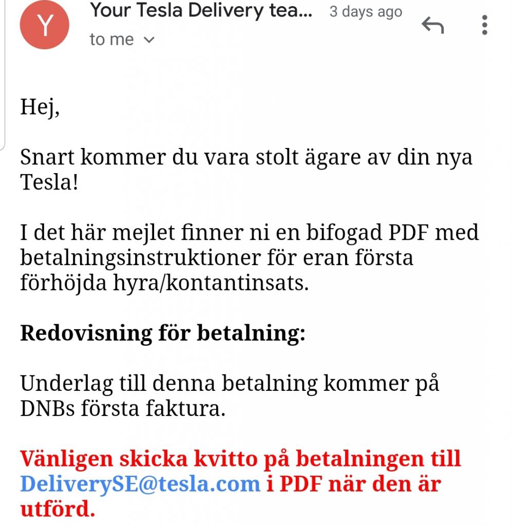 Håller tummarna då att jag får Reg nu under dagarna. Förutom dolt VIN har jag enbart RN på mitt tesla account, varken något datum för estimated delivery eller någon slutfaktura än :( antar att man får det när det verkligen är nära.
