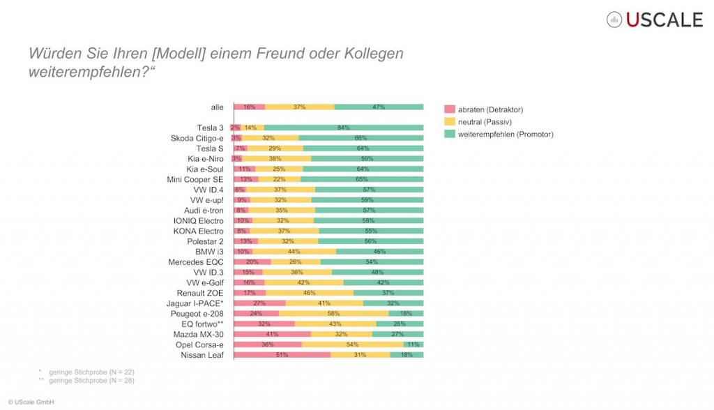 medan 3 procent rekommenderar det. Sedan kommer Tesla Model S med 64 procent som skulle rekommendera det och 7 procent som