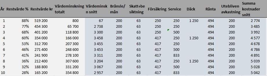 Jag bygger värdeminskningen på en tabell från BilSweden, men jag har i andra sammanställningar kommit fram till liknande eller något sämre siffror. Värdeminskningen är ju den enskilt största posten som påverkar kalkylen och är samtidigt den svåraste att "gissa".