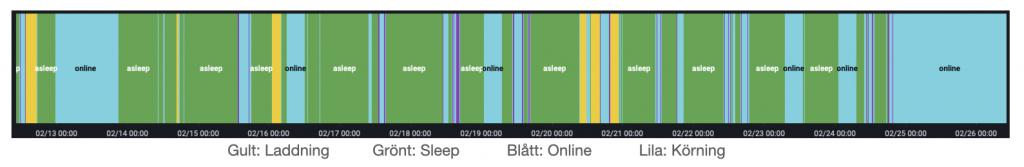En planerad sjuktransport av en släkting på morgonen den 14/2 fick bli fossil. Vid närmare analys av Teslamate-data visar det sig att bilen varit Online i 20h från midnatt 13/2. Under tiden tills nu har bilen varit Online 6h, med felkoder, vid 4 olika tillfällen och nu senast 2022-02-24 från kl 19:47. Bilens SOC har vid senaste tillfället gått från 28% till 13% (27/2 kl 19), d v s en SOC förlust på ca 0,2% per timme. Batteriet beräknas alltså ha SOC = 0% på kvällen den 1/3. Djupurladdning lär sedan inte vara långt borta. Intressant att se om BMS tillåter detta. Fram till 24/2 har det varit möjligt att använda bilen i stort sett som vanligt när det inte funnits några aktiva felkoder. Med viss nervositet får jag tillägga! Om jag inte haft Teslamate och inte kollat bilen 13/2 hade jag kanske inte märkt något alls förrän 24/2. Bilden nedan visar vilka tillstånd bilen varit i sedan12/2. Bilen är även Online t ex när Vaktläget är aktivt och tydligen 13min vid vissa tillfällen.