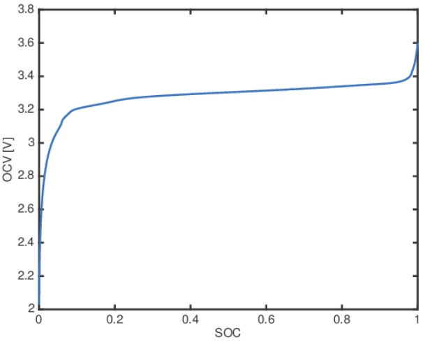 Om vi jämför med OCV vs SOC kurvan för ett NMC-batteri så ser den ut ungefär som i figuren nedan. Kurvorna för ett NCA-batteri har ett liknande utseende. Själv har jag dock bara verifierat den här typen av kurvor för batterier av NMC-typ.