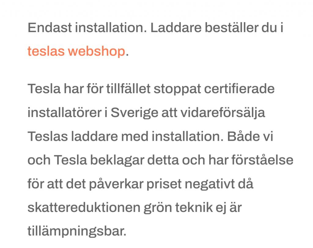 Älskar att Tesla beklagar att de slutat sälja laddare till certifierade elektriker... Kan det finnas någon rimlig förklaring till detta? Verkar ju bara sjukt.Ilduce77 skrev:Det verkar så, enligt Järfälla energi..Gustaf80 skrev:Inte svaret på din fråga men min granne som är elektriker installerade vår Wall Connector i höstas och jag har beställt en till via honom som ska installeras nu i närtid. Det följer med tydliga instruktioner och så länge elektrikern beställer laddaren från Tesla så får du grönt avdrag. Sen om det blivit någon förändring sedan i höstas kan jag inte uttala mig om.
