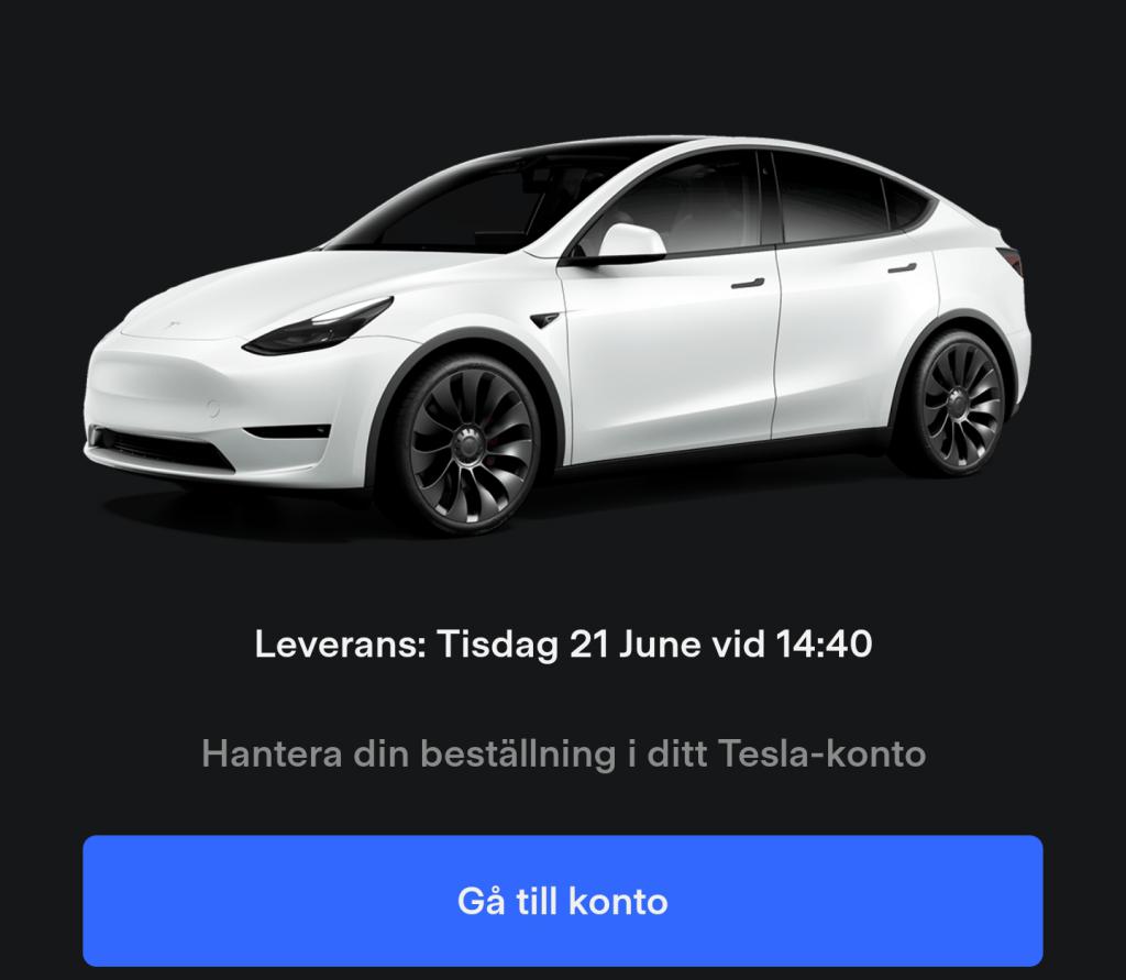 Beställt Model Y Performance den 12/2 2022 - Levererad den 15/6 2022