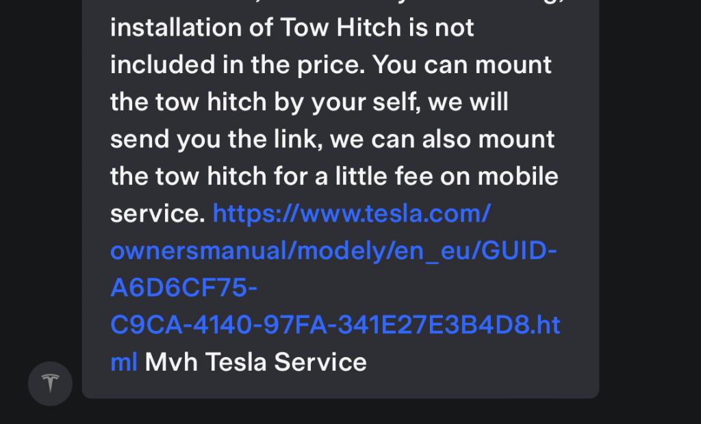 Som någon annan har skrivit, oavsett vilka löften man får så kan man inte räkna med att det faktiskt går att eftermontera krok på en Tesla, se till att få den monterad vid leverans istället.