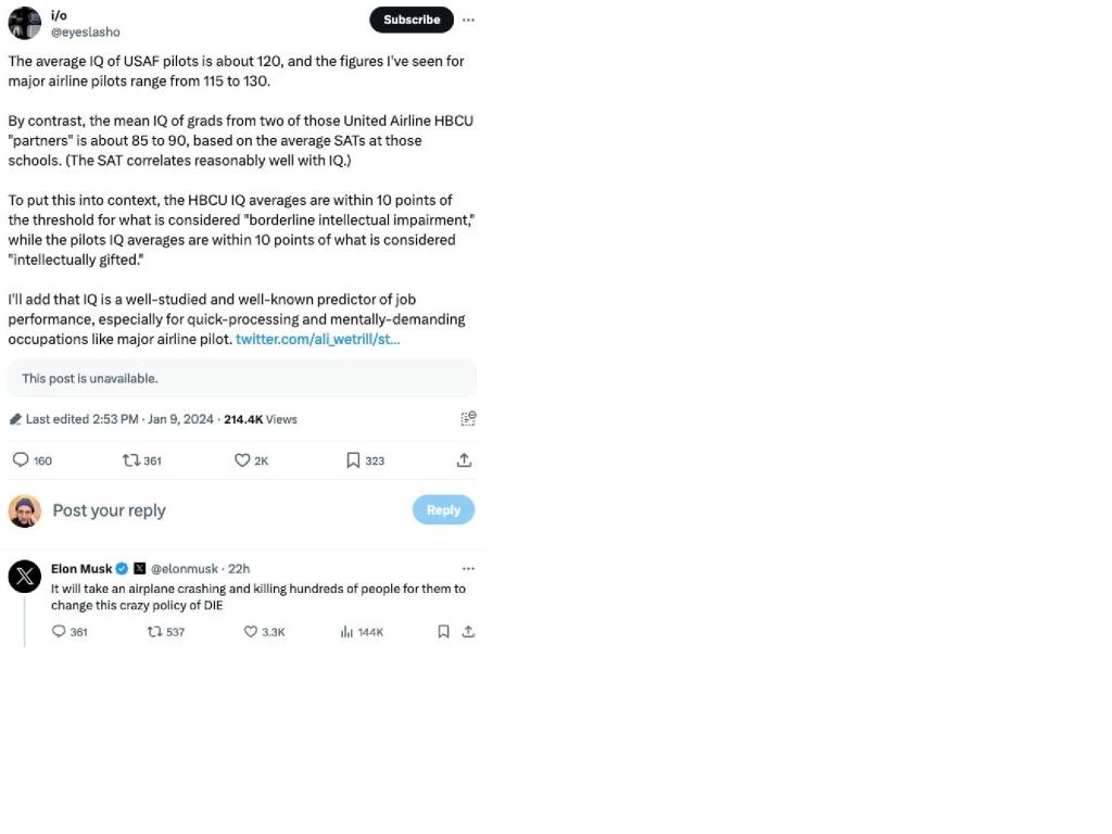 "Elon Musk endorsed a tweet suggesting Black students at Historically Black Colleges and Universities (HBCUs) have lower IQs and shouldn't become pilots.