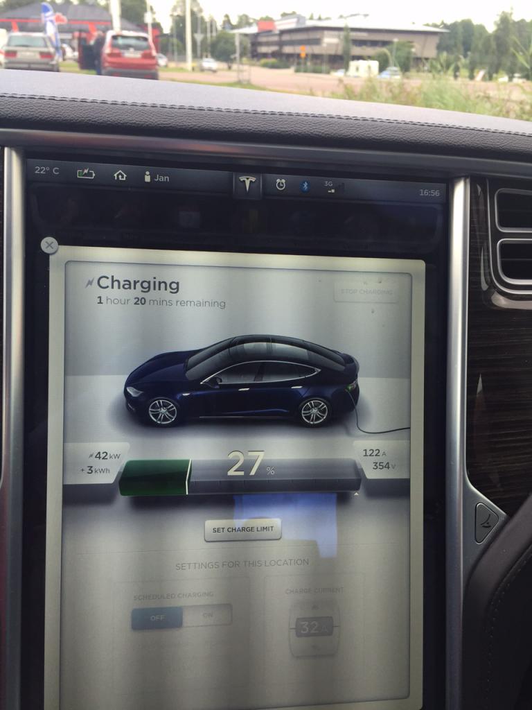Laddade i Sundsvall Birsta. 42 kW/ 20 mil per timme. Laddade i en timme och 15 minuter med en skylt om att jag kan flytta inom tio. Det står att man får ladda max 30 minuter. Den var där innan Tesla kom med sin adapter. Ja jag vet att det finns en SC en mil därifrån men har tröttnat på Sibylla maten :)