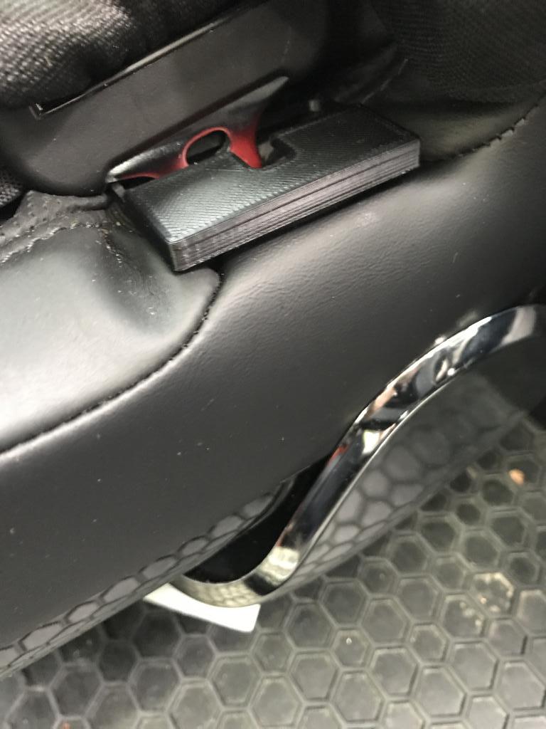 Det är lite spännande att det funkar med den med kant på ena sidan, men inte på andra då bältesfästet sitter så olika på stolarna. Till den ena sidan skulle kanten behöva vara runt 2mm, men jag använder den utan kant nu. Den med kant funkar utmärkt på andra stolen dock.