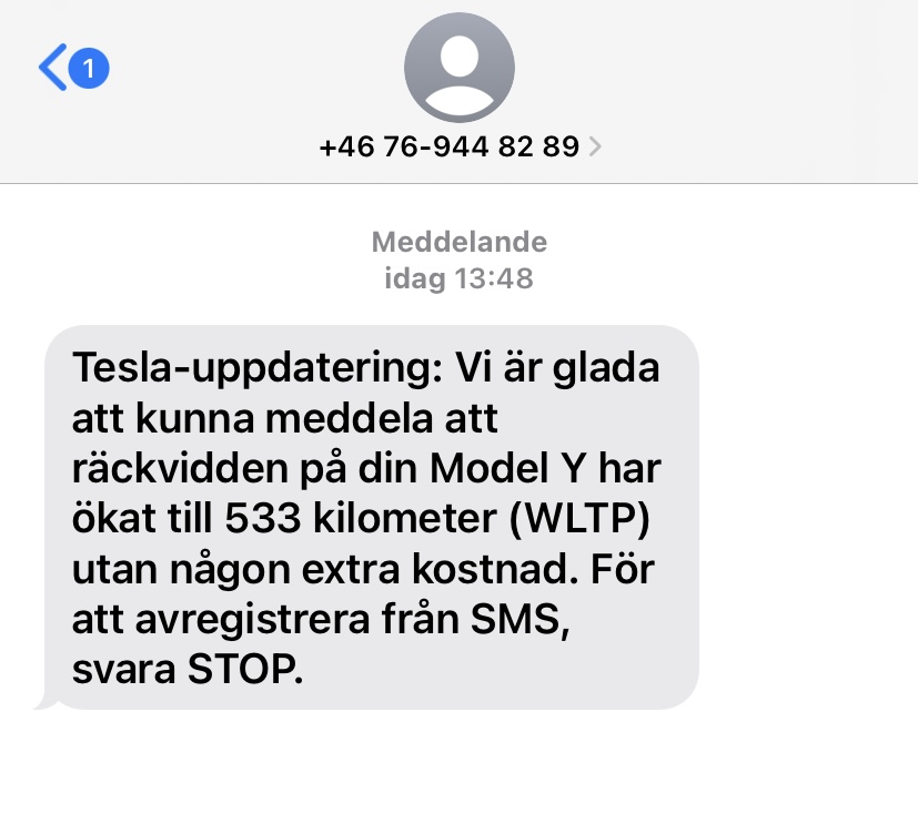Fick nyligen SMS från Tesla att dom uppgraderat räckvidden på min beställda Model Y :)