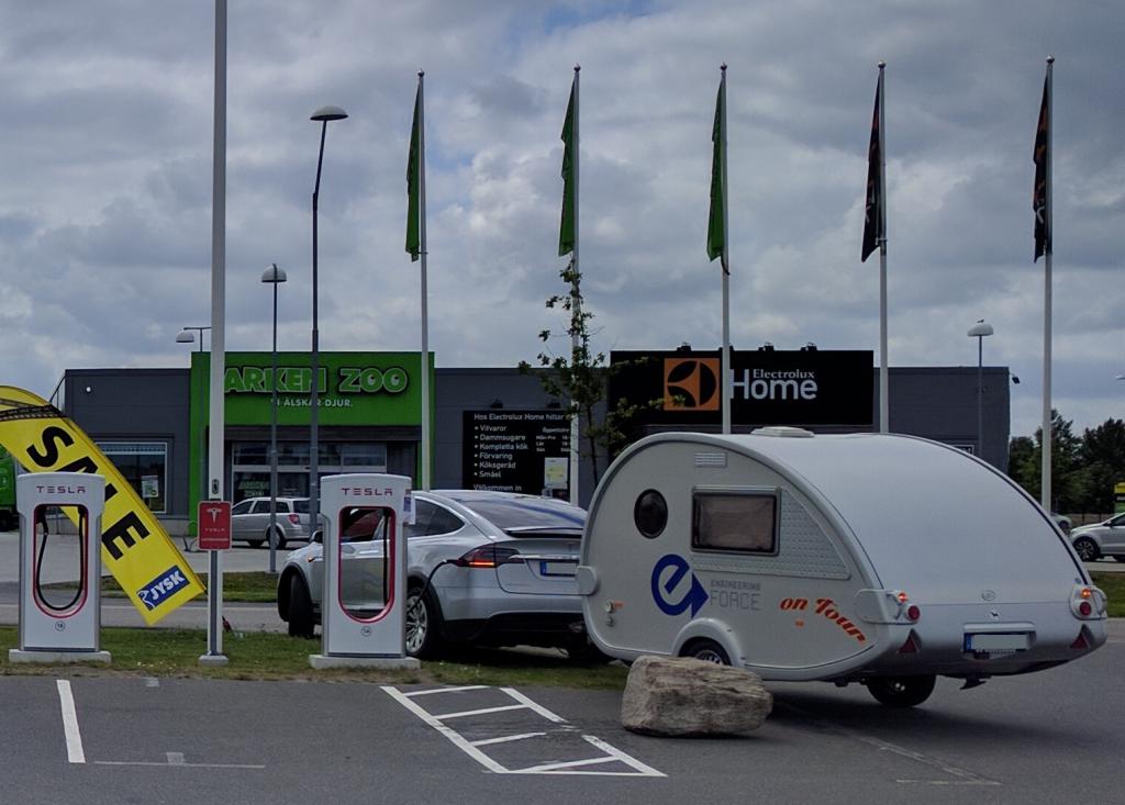 Problemet med utformningen i Löddeköpinge och släp är att man antingen står en bit ut i vägen med släpet eller att man trailar en laddplats. Kör man med släp får man nog se det som en bonus om man kan ladda utan att koppla loss, men får räkna att alltid göra det.
