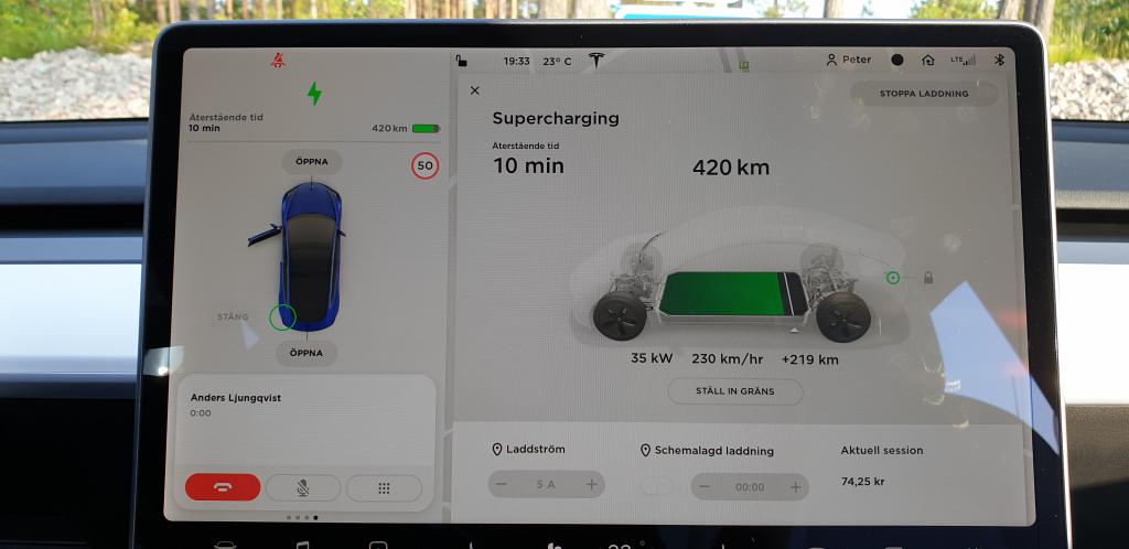 hämtade vår pärla "Stora Blå" igår... skulle stanna i Gävlebro för ett snabbstopp fylla på lite "jos" passade på en snabbmiddag... fanken kom ut så var bilen nästan fulladdad. dom är bra snabb dom där laddarna. laddade med ca 230km/hr när den nästan var klar för den sätta nivån...80% och fantastiska 74,25kr