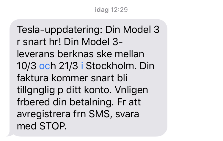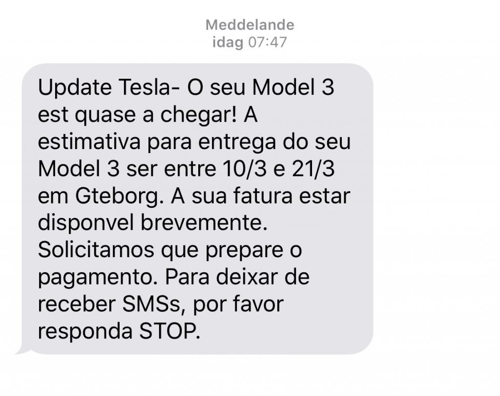 ”Update Tesla- O seu Model 3 est quase a chegar! A estimativa para entrega do seu Model 3 ser entre 10/3 e 21/3 em Malm. A sua fatura estar disponvel brevemente. Solicitamos que prepare o pagamento. Para deixar de receber SMSs, por favor responda STOP.”