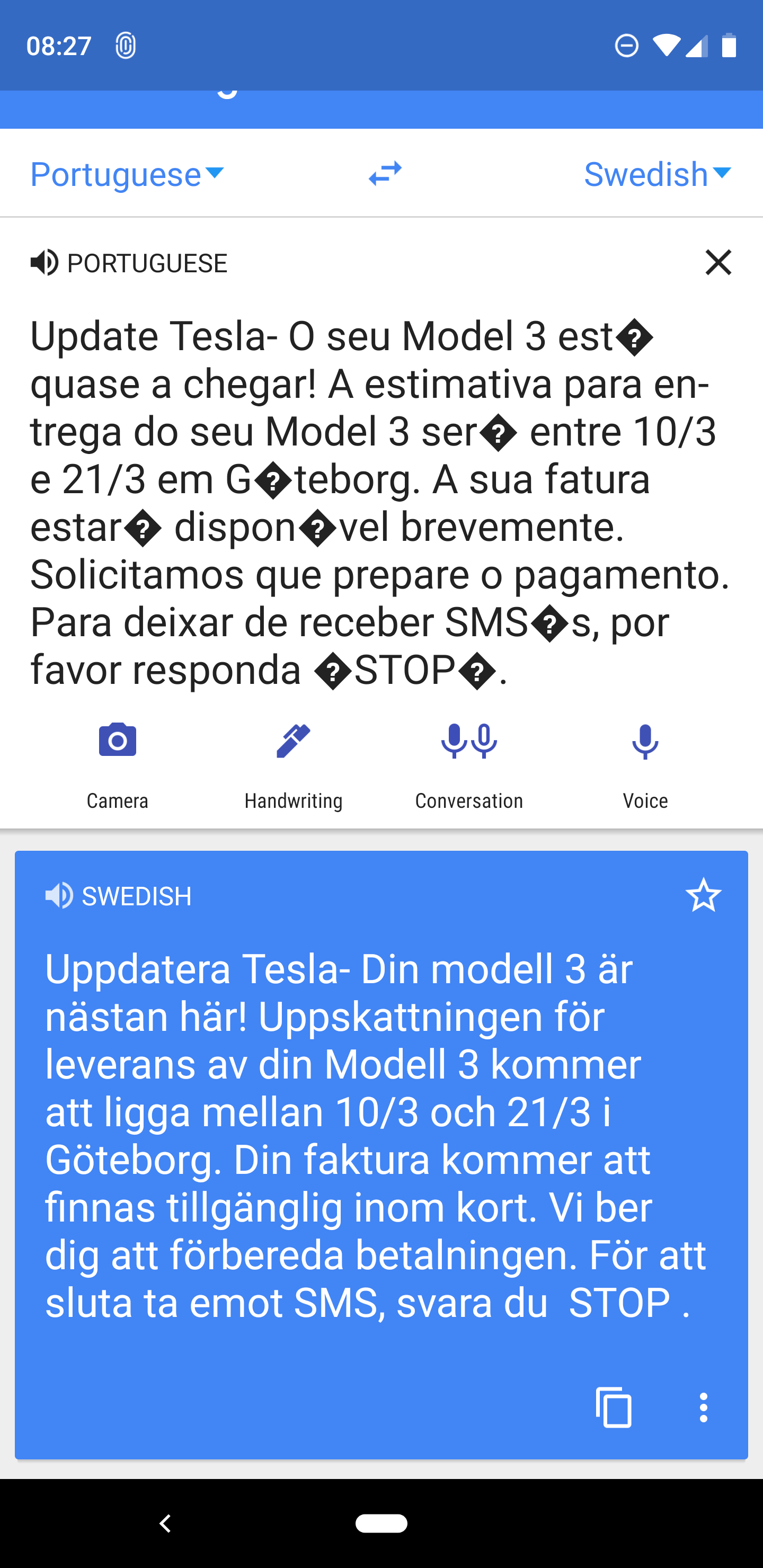 Update Tesla- O seu Model 3 est� quase a chegar! A estimativa para entrega do seu Model 3 ser� entre 10/3 e 21/3 em Stockholm. A sua fatura estar� dispon�vel brevemente. Solicitamos que prepare o pagamento. Para deixar de receber SMS�s, por favor responda �STOP�.