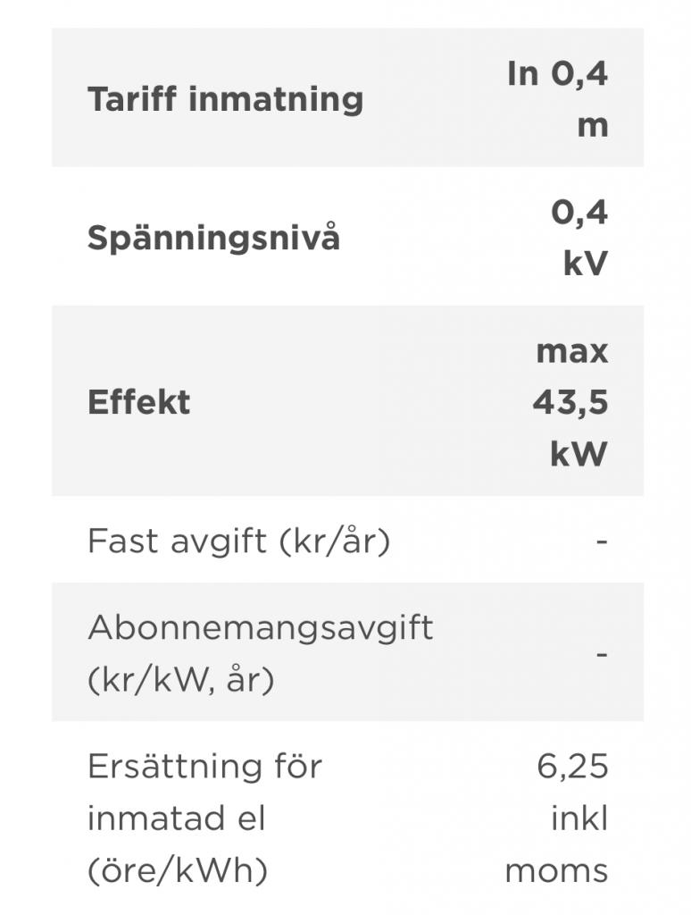 Jag har E.On som nätägare och elleverantör, de betalar nu spot+10 öre för överskottet. Följer upp anläggningen noga och räknar kontinuerligt ut hur mycket "förtjänsten" är och hur jag ligger till med återbetalningen. Räknar med att den ska vara betald på 6-7 år, men efter nästa år, om de nu har grävt ner kabeln, så blir det väldigt spännande att se vad anläggningen verkligen ger.