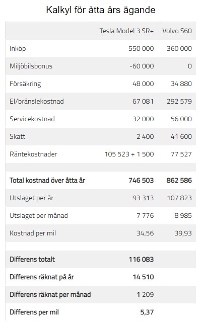 Här en exempel mellan en Tesla M3 och en Volco S60 jag gogglade fram lite snabbt, två år gammal, men kan ge en hint om hur man ska tänka/räkna på ett bilägande;