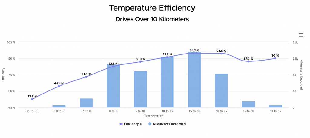 Som redan beskrivits, km-mätaren vid batteriet harcen fast gradering i Wh/km ovh påverkas inte av körstil eller årstid.
