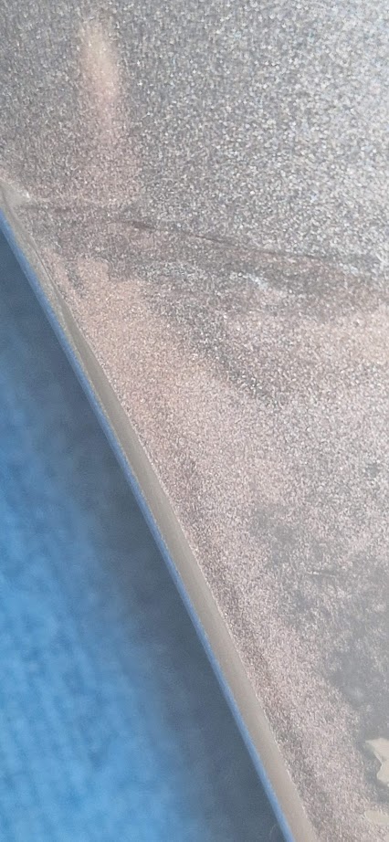 Det ser mer ut som smuts än lackskada. Och den gråa ytan blir bara större och större. Om man skrapar lite med nagel i kanterna på den grå delen så ser man att med lite tur så får man bort "smutsen" efter massor av gnuggande med nageln. Nu är min nagel helt slut men det är mycket skit kvar som sitter stenhårt! Man kan se mina klösmärken med nageln i bilden: Jag ringer tjocka släkten som har haft lackfirma i 40år men har nyss gått i pension, jag tänker de vet säkert vad det är. Min beskrivning av hur polermaskinen beter sig får dom att säga att den maskinen är trasig, klart du ska kunna trycka lite för att kunna polera.