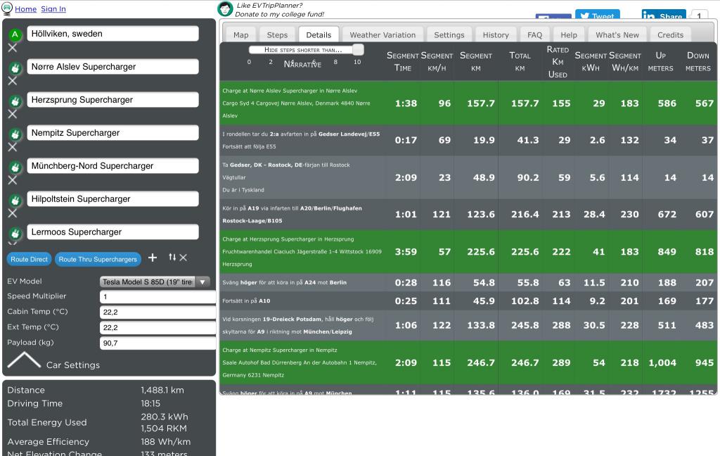 Tror att den funkar ok, men tyvärr ganska dåligt gränssnitt. Tror att dina 4 timmar syftar på körtid och laddtid tillsammans för den delsträckan. Vi har en riktigt vass kille på kartor på vårt konsultbolag som håller på att knåpa ihop en snyggare lösningvigge50 skrev:Har svårt att ta den sidan seriöst eller så har jag missförstått detta med laddtider helt. När jag skriver in från Höllviken söder om Malmö till Milano så vill den att jag ska stanna och ladda 1:38 i Danmark och sen 4 timmar på SuperChargern i Herzsprung, Tyskland. Är inte hela tanken med Superchargers att du bara ska behöva ladda i 20-30 minuter?Lessmog skrev:Det går ju att göra med https://www.evtripplanner.com/ även om det blir lite mera meck. Å andra sidan betydligt mer detaljer och realism - den räknar in väder, last, höjder osv. dörr till dörr.TiborBlomhall skrev:Borta tyvärr iom att den visade räckvidd för 70 och 85 modellerna - men 85 säljs ju inte längre.