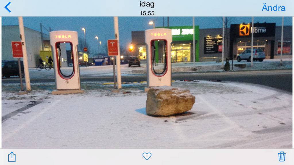 Ja, jag har läst din tidigare trist historia, bottenlöst och stor suck. Angående stenen så var den flyttad till markerade vita området ( varför den är där överhuvudtaget kan man undra) och låg där ett tag för nu på nytt vara inne på laddningsytanP. Övriga parkeringsområdet är ju fullt med liknande stenar. Min gissning är det säkert för att styra upp vildsinta kvällskörningarna på området.Andreas Muller skrev:Jocce skrev:Vart "bor" stenen egentligen?