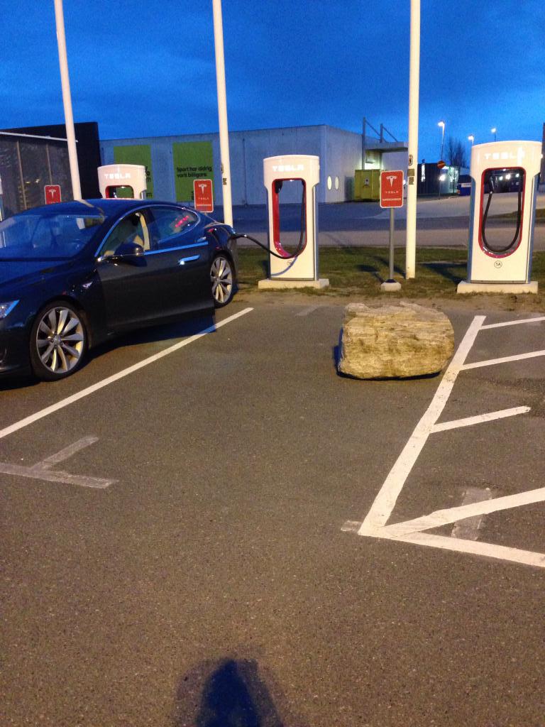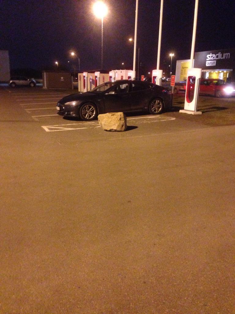 Stenen är nu flyttad till fördel för dem som vill ladda dvs denna ytterplats blir nu möjlig igen. Dock ökar risken för påkörning från infart och snäv sväng utan vara 100% uppmärksam.