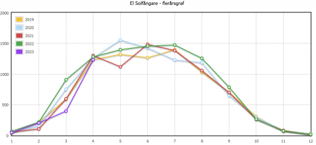 Mars i år var ganska mycket sämre än tidigare. Annars följer produktionen ganska väl de senast åren. Jag har inte diagram med mer data lätt tillgängligt. 14 grader lutning på taket så väldigt dåligt på vintern.