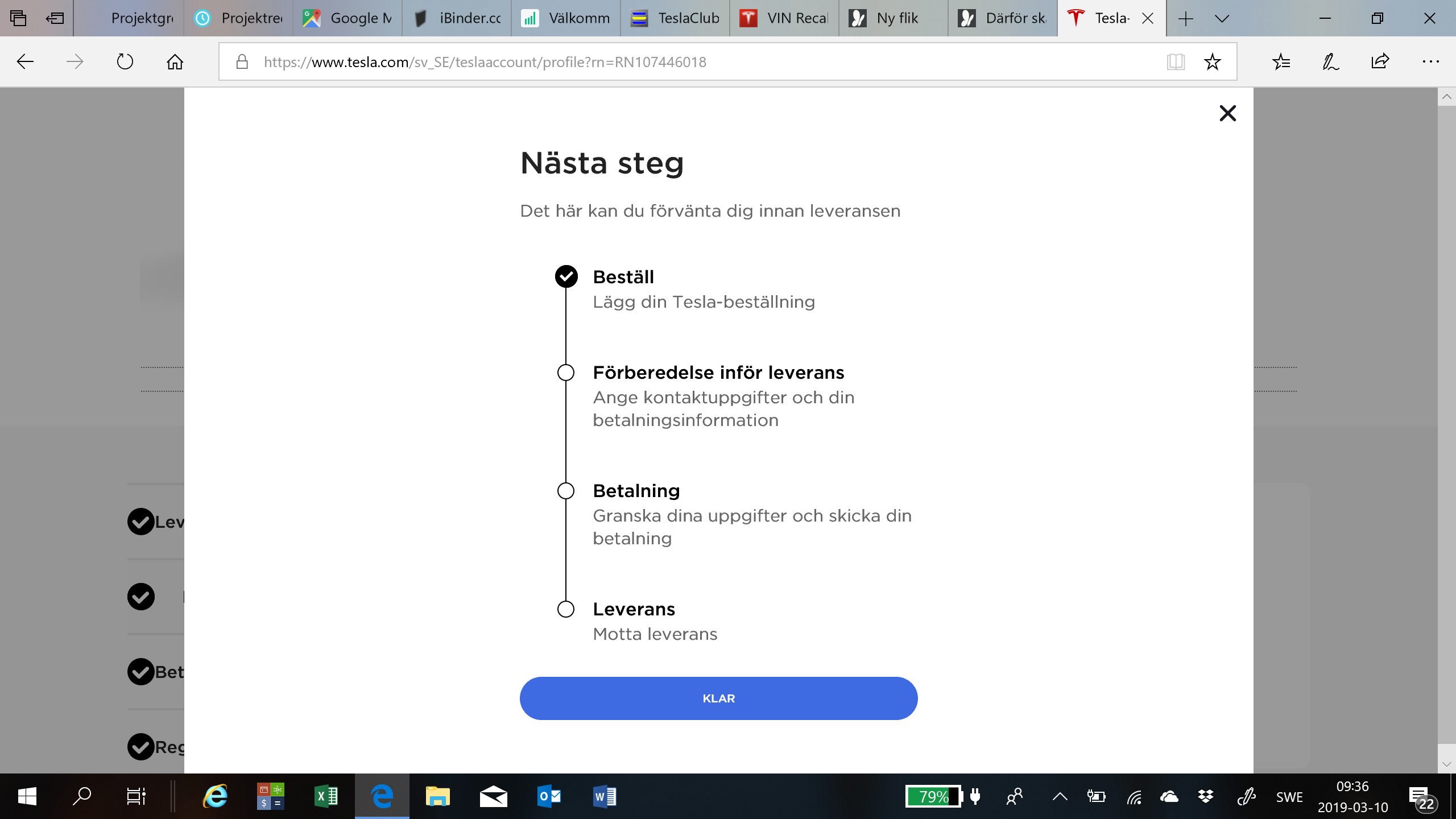 Jag skulle ringt till Tesla eller mailat deliverySe@tesla.com och frågat. Hur ser det ut på MyTesla på webben?Makman skrev:Jag undrar verkligen hur de prioriterar. Reserverade direkt det var möjligt, beställde en P och LR samma dag som konfig blev möjligt. Inte ett ord än, bara sms om betalningsalternativ. Tappar förtroende för att reservera långt i förväg. Kunde lika gärna bara beställt vid årskiftet?