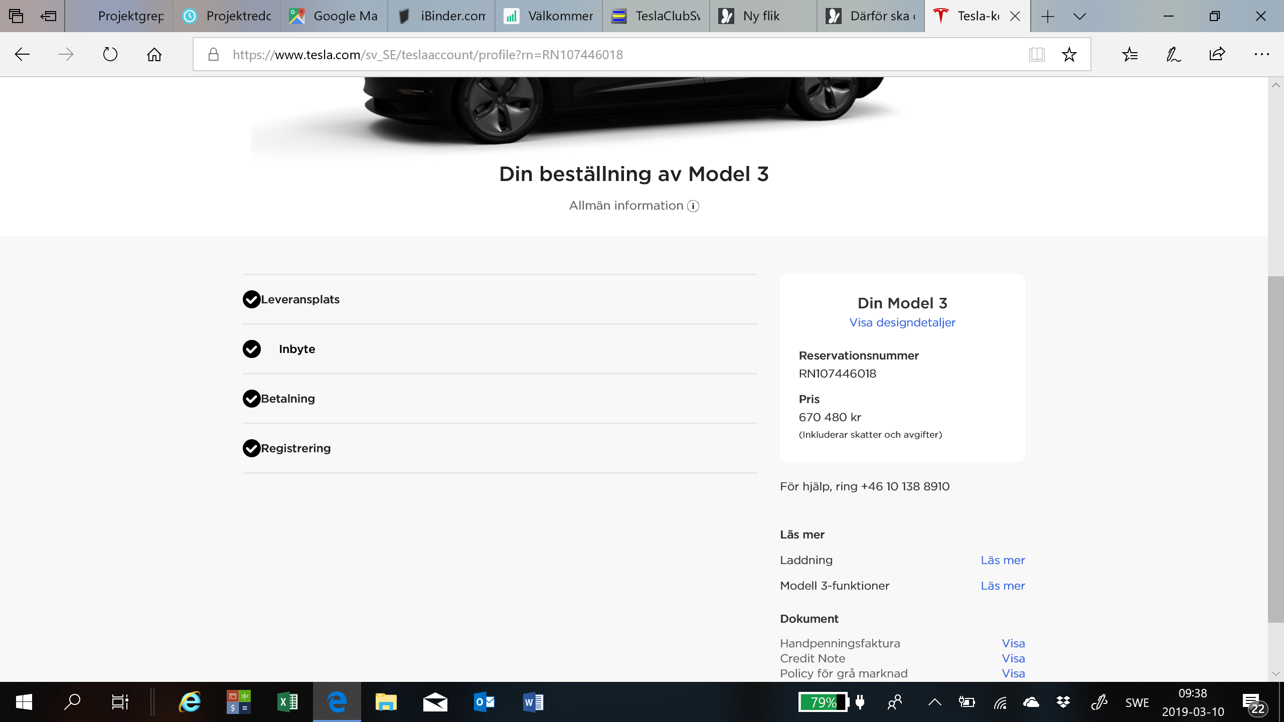 - Model 3 beställd 10/12-18: LR+AWD+AP, Midnight Silver Metallic, vit interiör