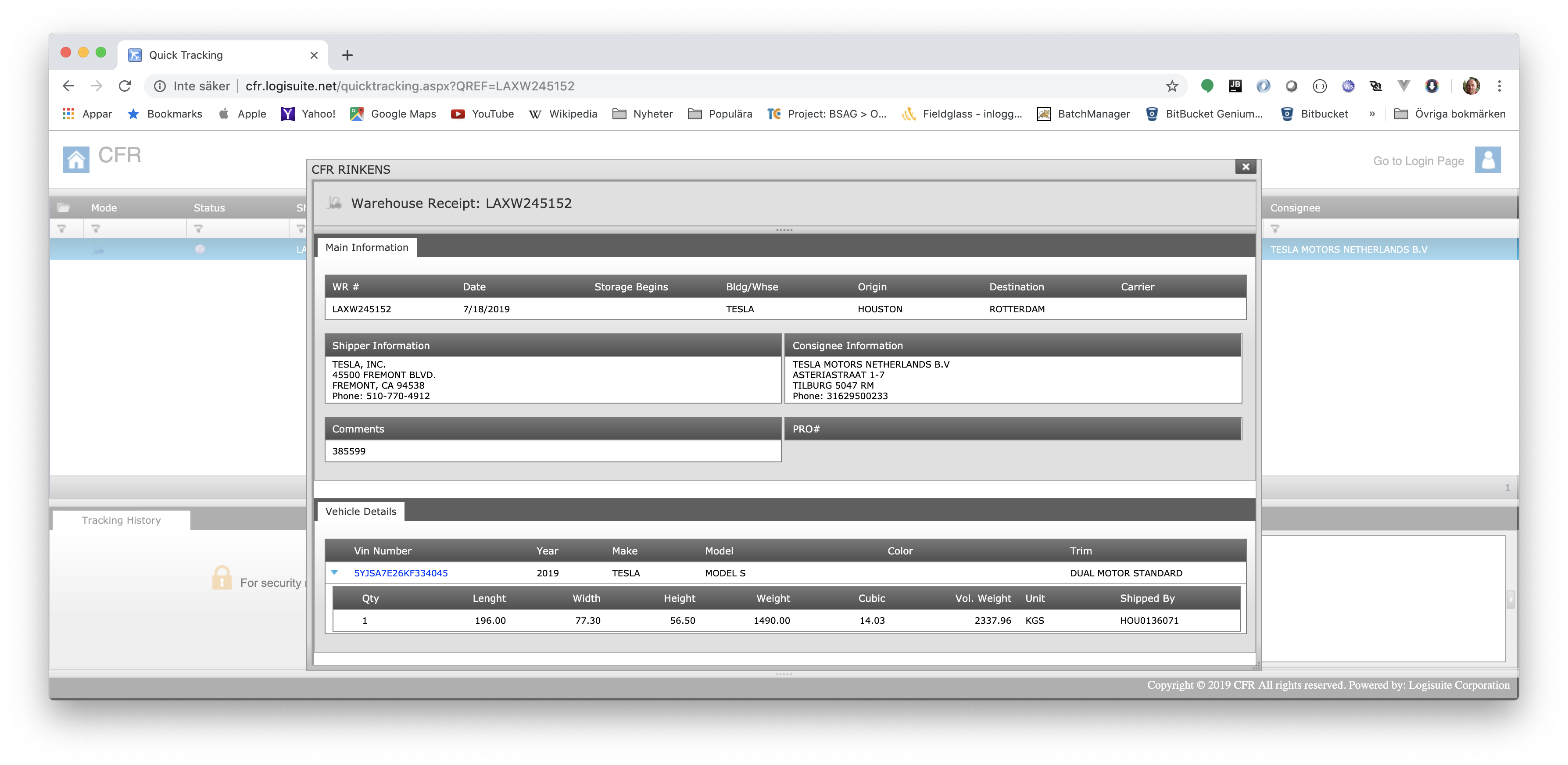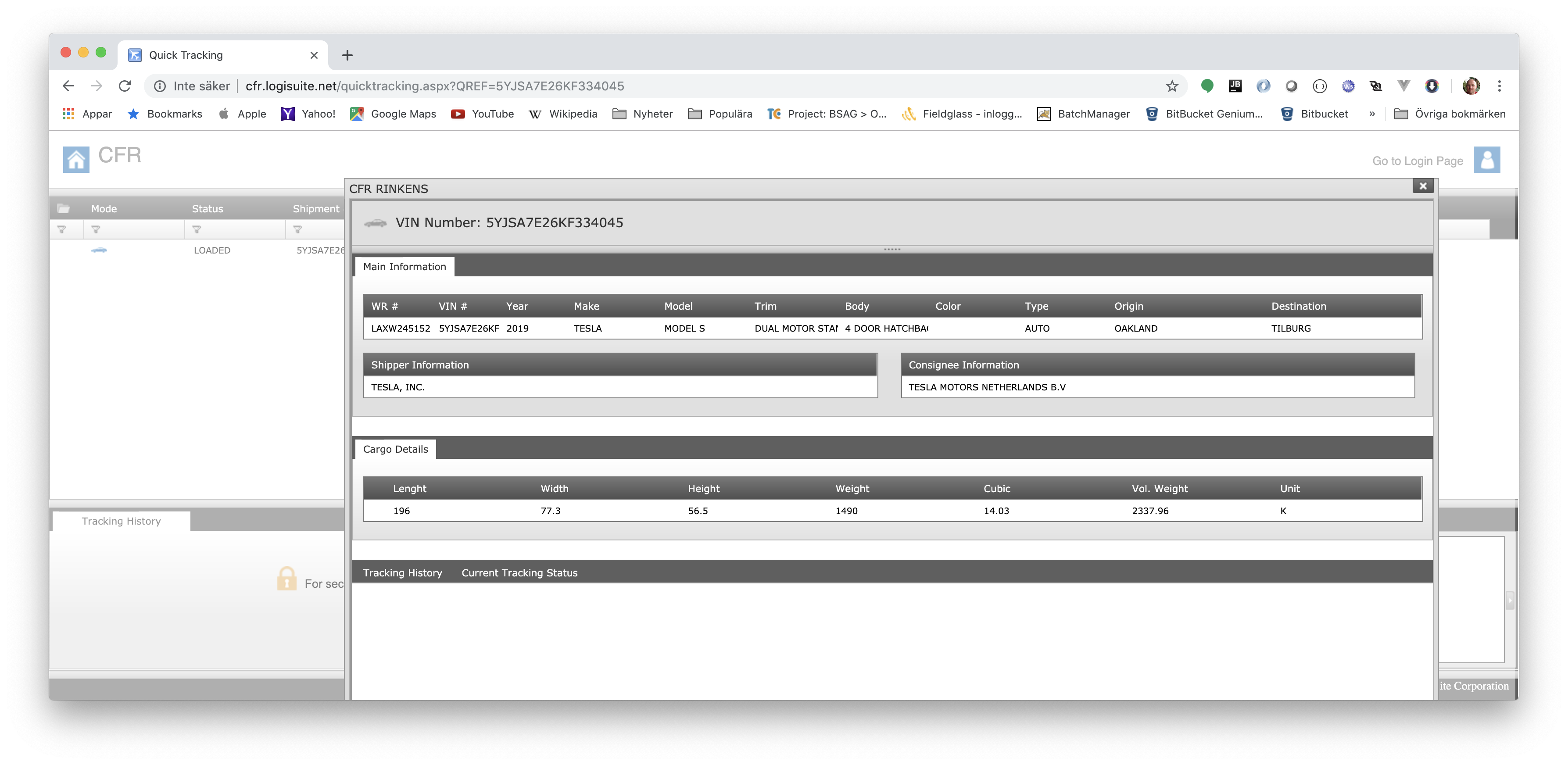 Gå in på http://cfr.logisuite.net/ och mata in ditt VIN som Tracking Number. Då kommer följande bild upp.