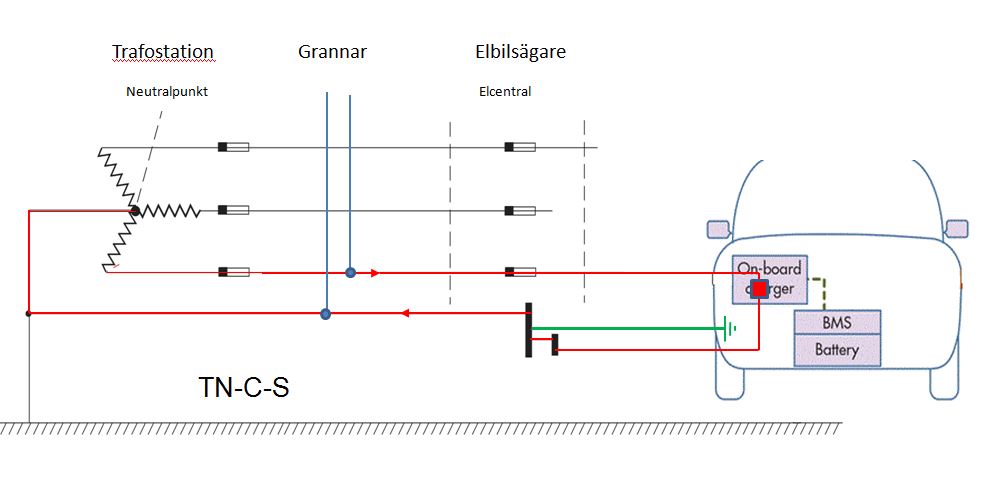 Bilden nedan visar strömbanan från områdets transformatorstation till elbilens laddare och tillbaka vid 1-fas laddning. Liknande gäller för 3-fas.