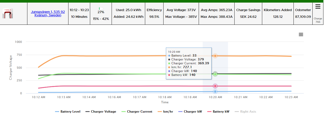Jag noterade nytt rekord på Sundsvall West häromdan, 240 kW. Dock "bara" 120 kW efter 5 minuter, men jag fick en rejäl påfyllning medan jag gick till ICA och handlade.