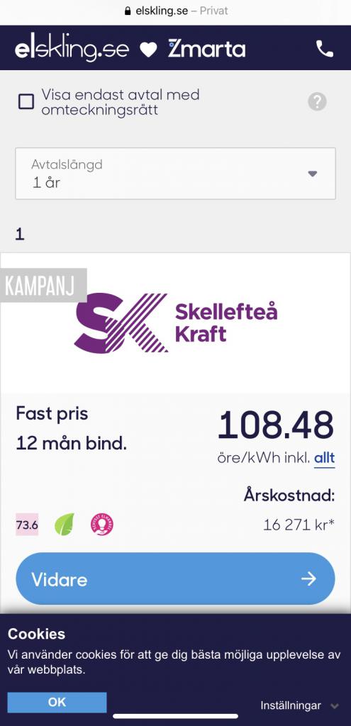 Kanske lönar det sig att binda elen? På elskling.se har Skellefteåkraft erbjudande om att binda i ett år för 108,48 kr/kwh.