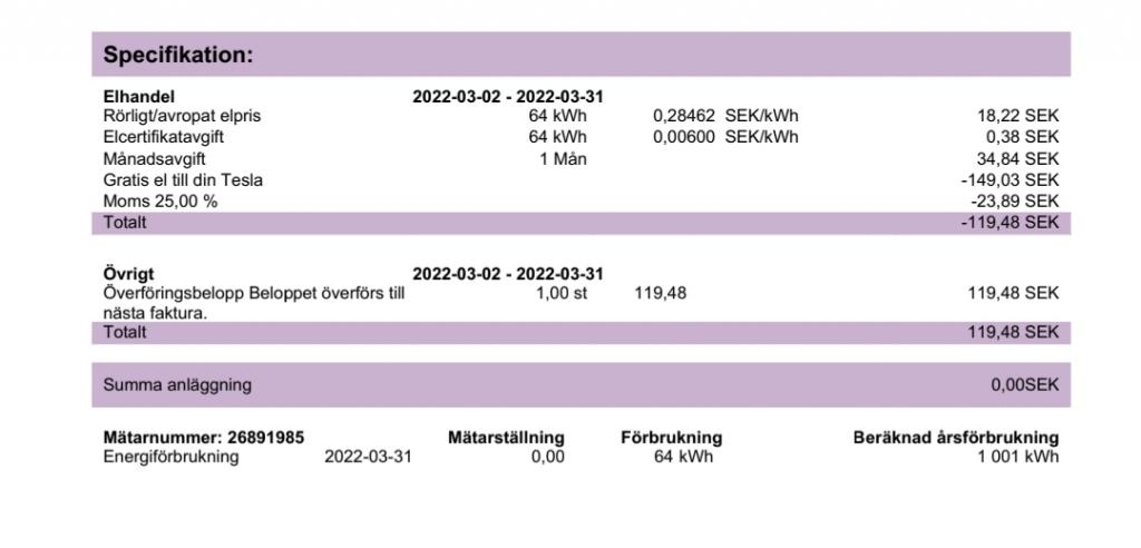 En annan bra grej är att Teslaägare kan få ett finfint elavtal för hemmaladdning med avdrag varje månad i 3 år.