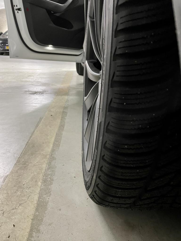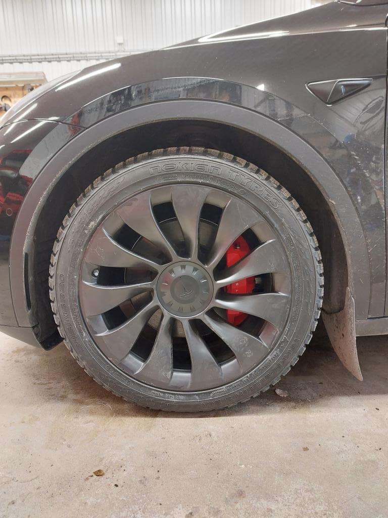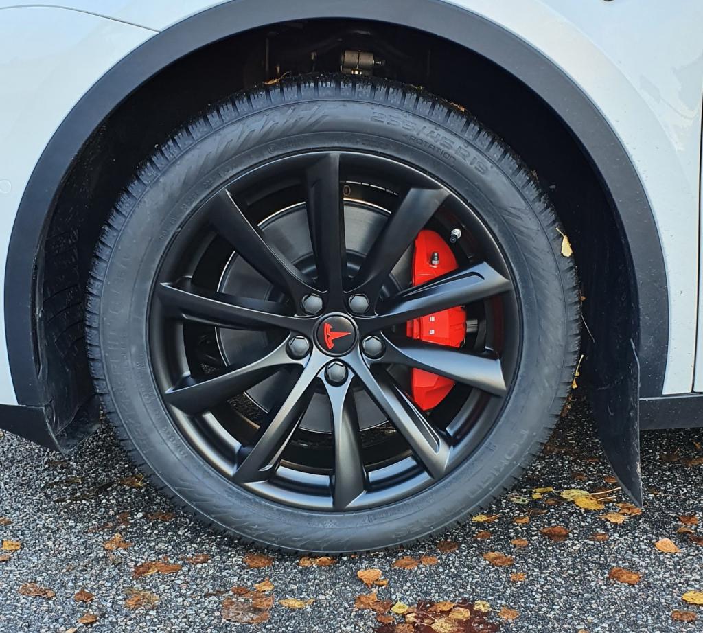 20x9.5 tums fälgar från model 3 performance med 245/45 hakkapeliitta 9 passar bra. Inga spacers. Däcken låter högt på asfalt