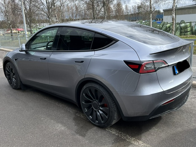 Här är min innan lackförsegling, PPF på nedre delen av dörrar och ”avkromning”/byte märken till svart T på huv och TESLA text på baklucka.
