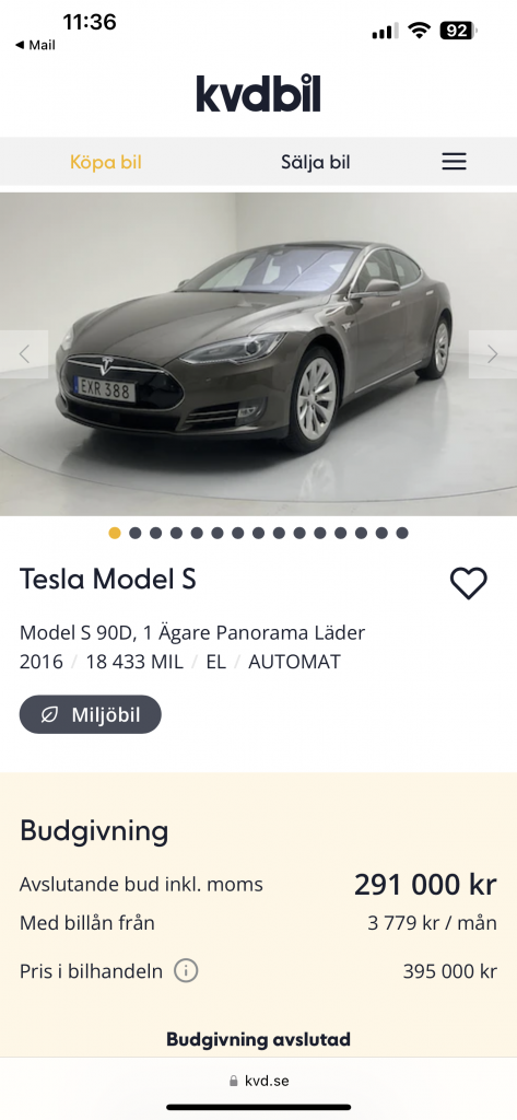 "Vi får all sådan info direkt från Tesla" sa KVD när jag sålde min Model S 2015 där. De fick inget om medföljande utrustning och ignorerade min lista som innehöll tillvalen samt info om fri supercharging. Som tur var hörde personen, som sedan också blev köparen, av sig direkt till mig och frågade. Hade ju så klart varit trevligt om även övriga i budgivningen med säkerhet haft koll på det.