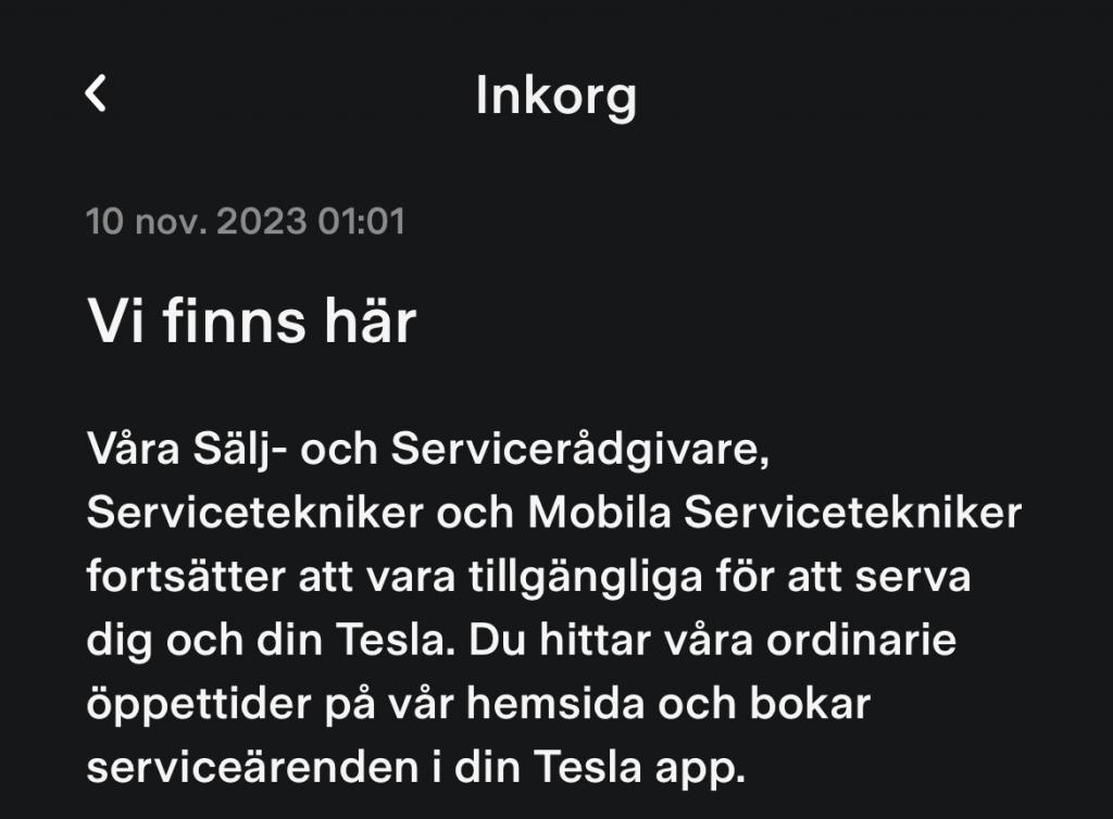 Jag skulle ändå säga att Tesla som organisation verkar klara sig ganska bra än så länge, de verkar ju fortfarande både leverera bilar och ha igång sina egna verkstäder.current skrev: ↑10 nov 2023 20:32Vad skönt det är att inte köra Tesla just nu.