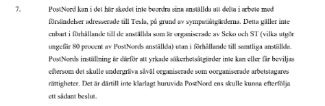 Eller egentligen borde ingen order behövas, det borde ligga inom ordinarie arbetsuppgifter som inte behöver påtalas (det är klart.. Tesla kan ju ha otur och det är ingen utanför facket som skulle hantera detta). Det vill säga.. Postgången kommer visserligen bli väldigt godtycklig, men en order som förbjuder alla att hantera posten borde vara lika orimlig som motsatsen. Det stämmer att man inte skall veta vilka som är organiserade, men i frånvaro av instruktioner borde normalt arbete efterlevas (av de som inte är i blockad)