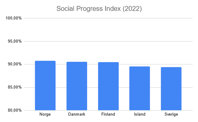 Fortsättning på tidigare och med Social Progress Index. Här är vi inte långt efter men klart sist. Notera dock att jag klippt den vertikala axeln för att påvisa skillnaderna mellan länderna bättre. Egentligen är det mycket liten skillnad men poängen är att vi har utrymme för förbättring.
