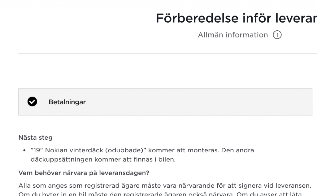 Jag har också beställt en lagerbil precis. Om du loggar in på ditt Tesla-konto, och sedan den beställda bilen och klickar på att visa Beställningsavtal. Står vinterhjulen med där? Det gör det på min.