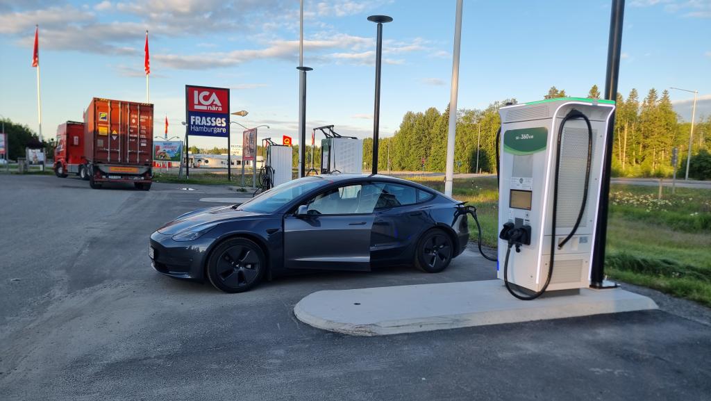 Ankom SuC Hudiksvall och ser efter en kort stunds laddning att en vägtrafik-bil köra av motorvägen och ställer sig med sina blixtljus vid avfarten. Förstår direkt att det är vingen den väntar på och att den ska av motorvägen där vilket skulle innebära att hela trafikplatsen snart skulle bli blockerad. Tar ett snabbt beslut om att avbryta laddningen och köra vidare några km norrut till Ionity där man kan ladda utan att bli instängd.
