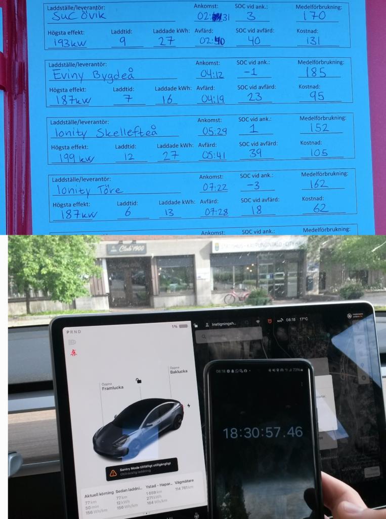 Som ni ser blev det en hel del laddningar och det beror som sagt på att bilen inte presterade som den gjort tidigare. Trots korta och effektiva laddningar (laddade max 40-46%) så blev laddtiden 9 min längre än ifjol.