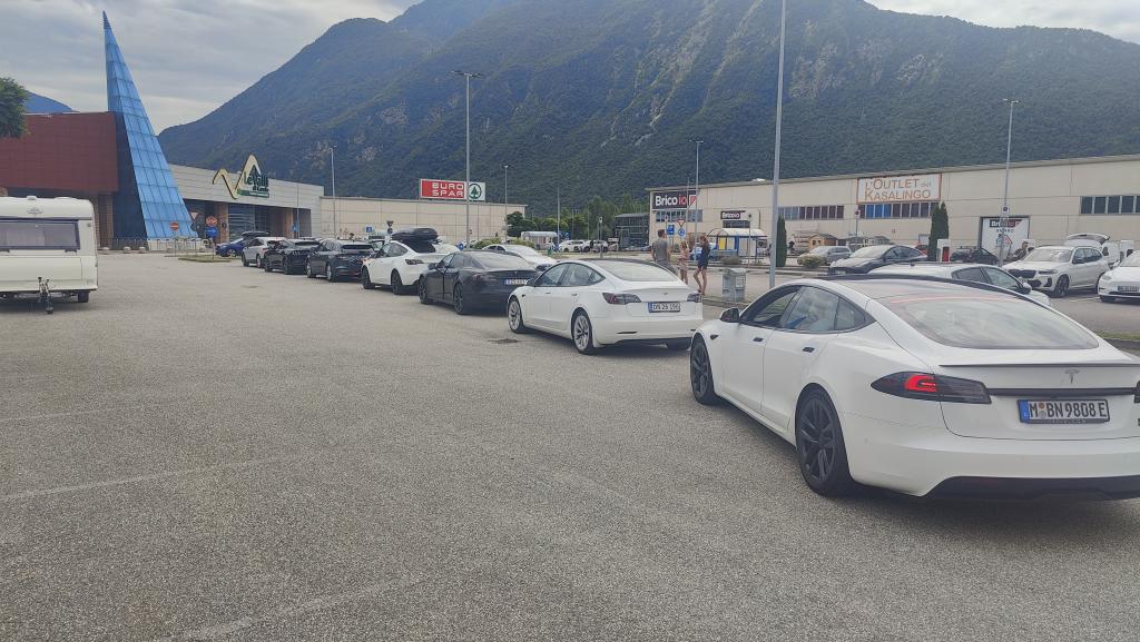 Valle di Carnia eller vad fan det heter. 12-14 bilar i kö till 8 laddare. Många icke Teslor. Nu enbart Teslor som laddar så när en blev ledig rundade jag fyra st som hade laddporten på fel sida. En dansk i en ID.3 hade nog tänkt testa att köra upp på trottoaren bakom och blev lite sur. Men jag gav honom gott om tid innan jag körde runt...