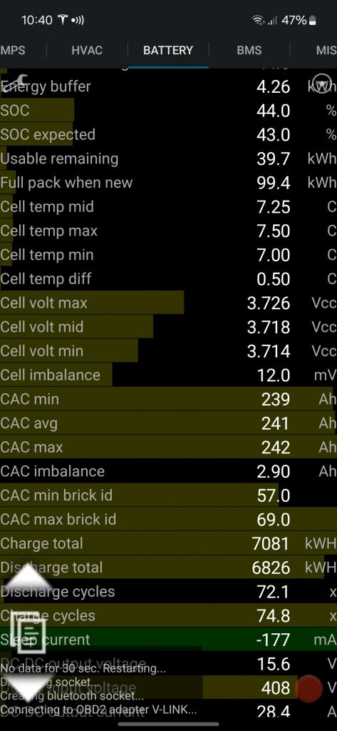 Min har tappat till 92.5kWh i takt med att CAC Imbalance ökat. Fortsätter sämsta cellgruppen nedåt kommer kapaciteten fortsätta nedåt.