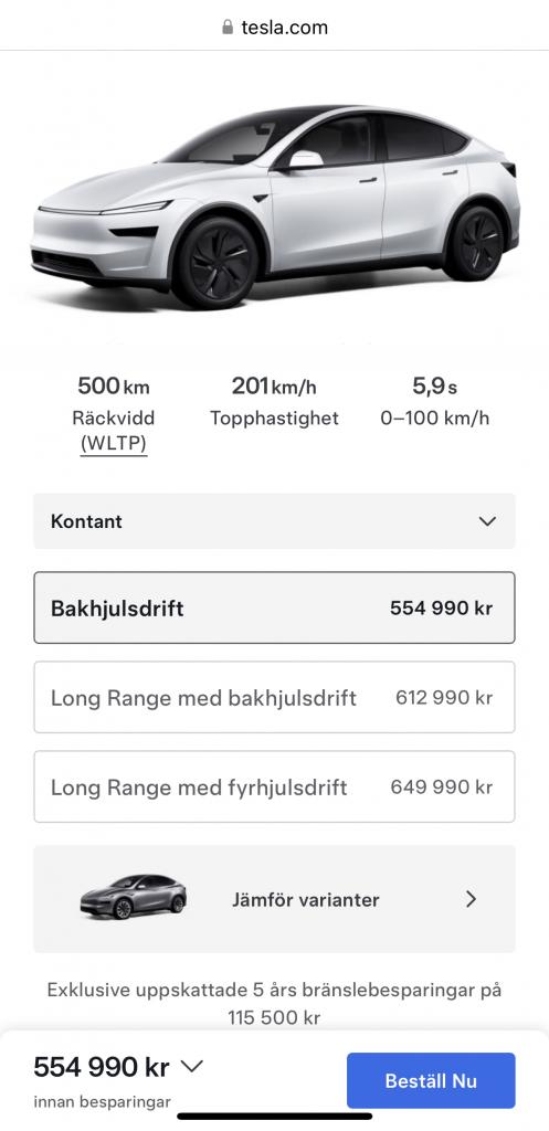 Ja, gamla Model Y var verkligen konkurrenskraftig under en period och med väldigt kraftig rabatt genom radikala prissänkningar och 0-ränta så sålde den riktigt bra.Teslasemitruck skrev: ↑23 feb 2025 02:06Det är ingen tillfällighet att gamla y sålde som den gjorde. Visst det finns billigare bilar och dyrare. Men sett till man får så ligger Y väldigt bra i pris. En batterirefresh på det om några år så kan nog modellen hålla väldigt länge.