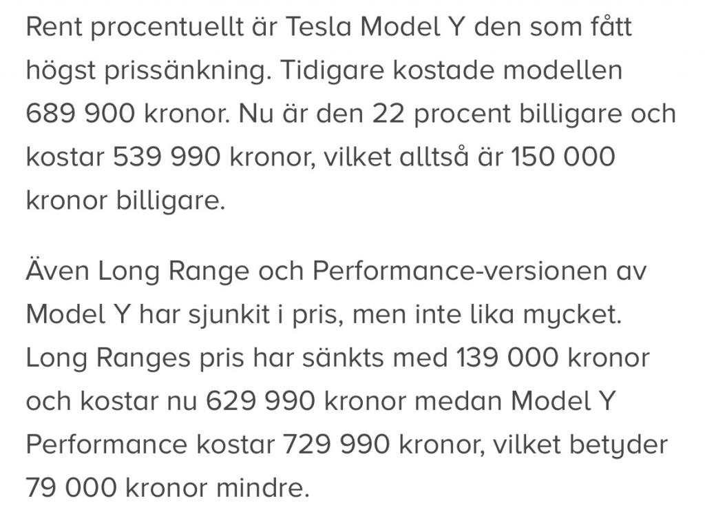 Artikel från juni 2022: Och artikel från jan 2023 efter brutal prisdump: Det många kanske glömmer är ju att man hade miljöbonus fram till nov-dec 2022, men det är en klen tröst på 70k. En naken Y var ändå 770 laxingar. Skulle man ha lite specs och vinterhjul så norr om 800 laxingar. Ville man ha en Performance så en bra bit över 800.