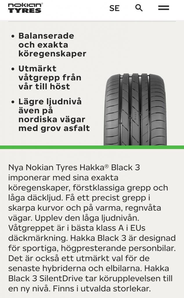Har precis beställt 4 st Nokian Hakka Black 3. Kommer gå från Michelin Pilot Sport 4, och köpte främst p.g.a lägre ljudnivå.